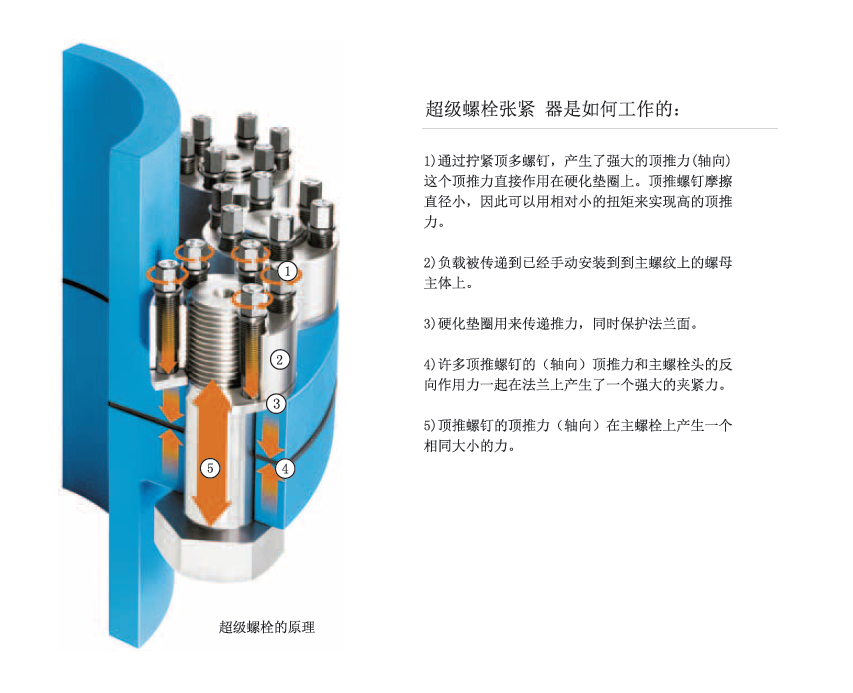 超級螺栓張緊器被設計來直接取代傳統的螺母和螺栓。這些裝置可以旋合于一個新的或者現有的螺栓,螺柱,螺桿或者軸上。主螺紋用于安置緊張器在螺栓或者螺柱上并靠在硬化墊圈及承載面上,一旦安置到位,螺栓或者螺柱的實際的張緊通過簡單的手動工具來擰緊環繞主螺紋一圈的頂推螺釘來實現。頂推螺釘均勻地傳遞預緊力到主螺紋上,從而,也傳遞到連接件上。主螺紋被純張力鎖緊。